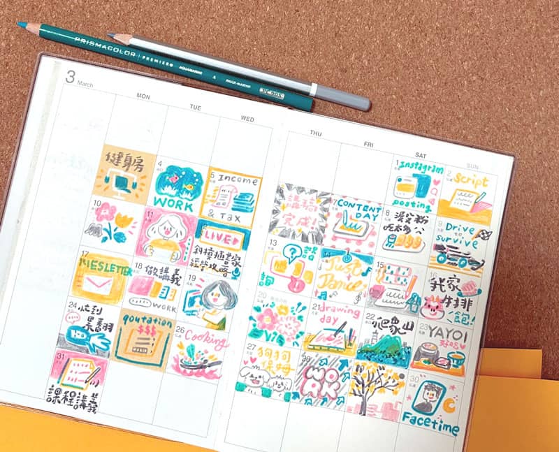 在每天的小格子畫一張代表當天的小圖,當作結束一天的小儀式